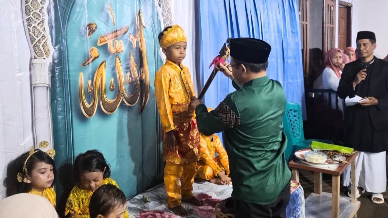 Penyematan keris dilakukan oleh tokoh masyarakat atau tokoh agama yang dihormati, disertai lantunan sholawat dan doa keselamatan bagi anak yang akan dikhitan. Suasana khidmat dan religius menyelimuti prosesi tersebut.